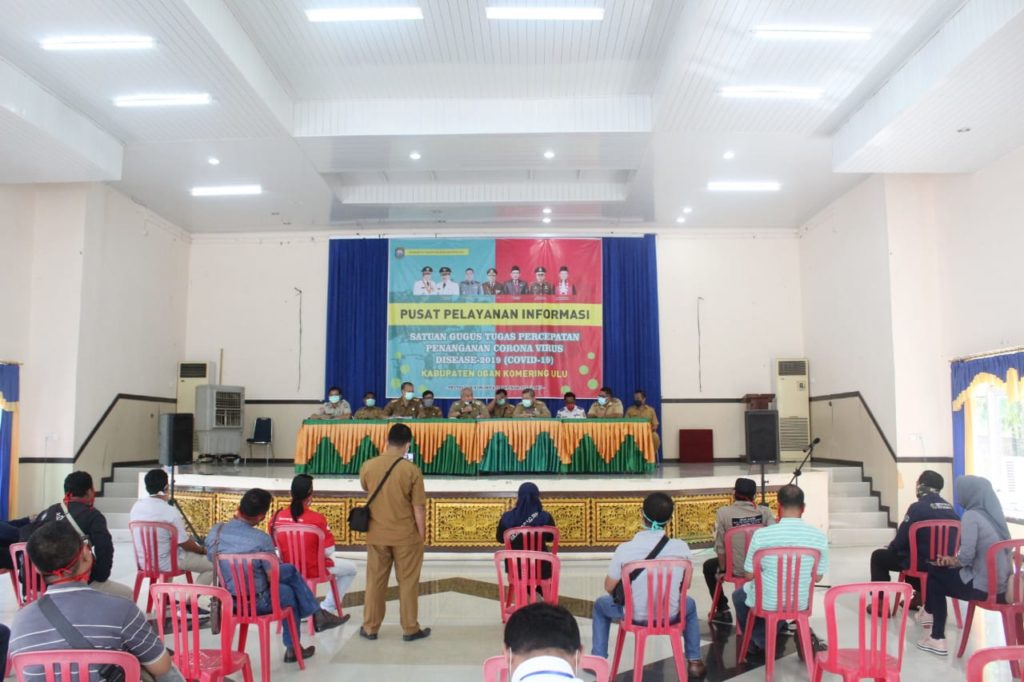 Guna mengantisipasi Wabah Virus Corona (Covid-19), Bupati OKU Drs. H. Kuryana Azis sampaikan Konferensi Pers, Bertempat Pusat Pelayanan Informasi Satgas Covid-19 di Aula Sanggar Kegiatan Belajar (SKB) Baturaja, senin (27/04/2020).