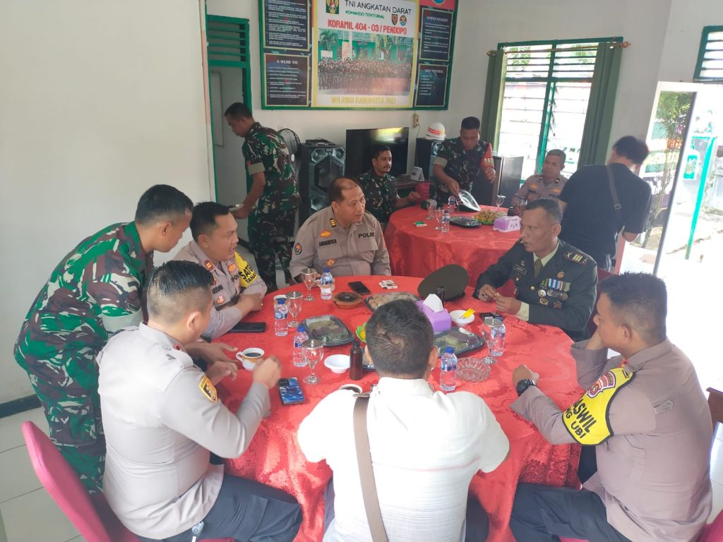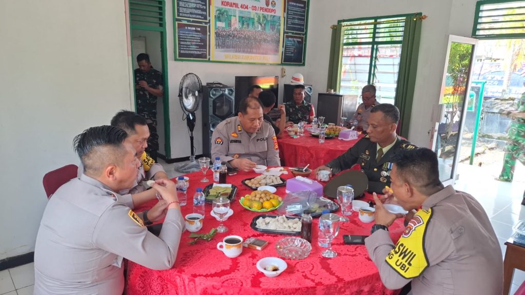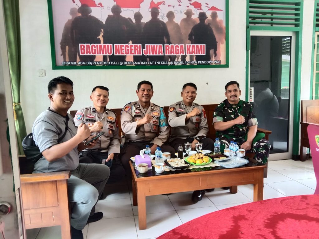 Rombongan Polsek jajaran Polres PALI yang dipimpin oleh Kapolsek Talang Ubi Kompol Rifan Wijaya, S.T., disambut hangat oleh Danramil 404/03 Talang Ubi, Kapten Inf Narko, beserta jajaran personel Koramil.