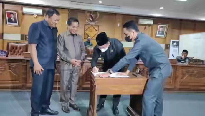Acara dilanjutkan dengan Penandatanganan dan Penyerahan Dokumen LKPJ Bupati OKU Tahun 2021 oleh PLH Bupati OKU H. Teddy Meilwansyah, kepada Wakil Ketua I DPRD OKU Yudi Purna Nugraha. (rel/feb)