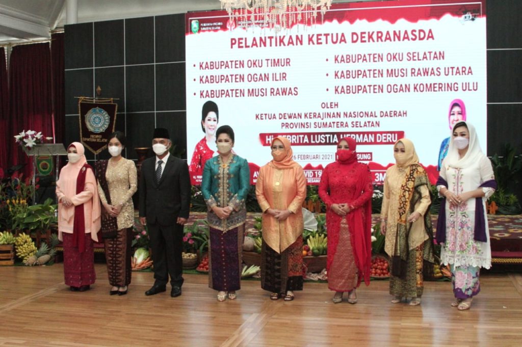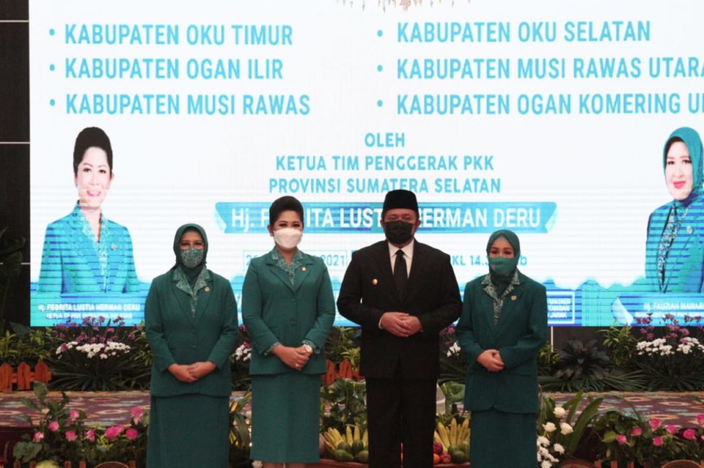 Ketua Tim Penggerak PKK Sumsel Hj. Febrita Lustia Herman Deru Melantik dan Mengukuhkan Hj. Badiar Dewi Kuryana Azis sebagai Ketua Tim Penggerak PKK Kabupaten OKU Bertempat di Griya Agung Pelembang, Jumat (26/02/2021).