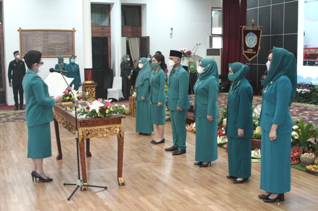 Usai prosesi pelantikan dilanjutkan dengan pemberian ucapan selamat kepada ketua tim penggerak PKK kabupaten OKU Hj. Badiar Dewi Kuryana Azis, dan lima ketua tim penggerak PKK kabupaten lainnya.